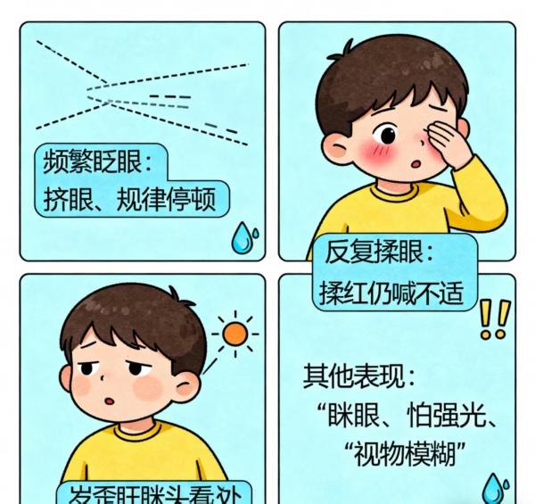儿童干眼症的症状与成年人有所不同,不会出现明显的 “眼睛干涩、异物感” 等清晰表述,更多是通过行为表现传递信号。家长若发现孩子有以下情况,需警惕干眼症的可能: