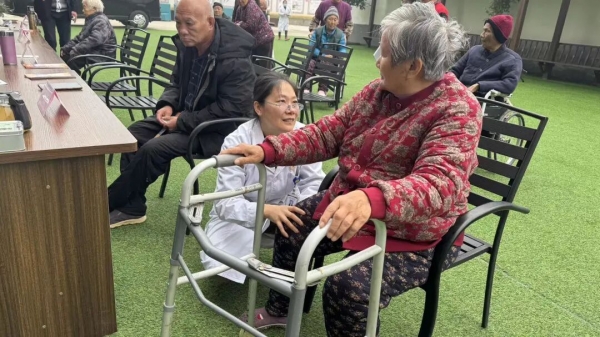 “大爷,您血压有点高,药按时吃了吗?”“奶奶,这个动作每天做十次,对肩膀好。”关切的声音在活动现场此起彼伏。护士们一边熟练地测量血糖血压,一边轻声叮嘱注意事项。银发老人们在医护人员搀扶下逐个检查,皱纹里漾开笑意。