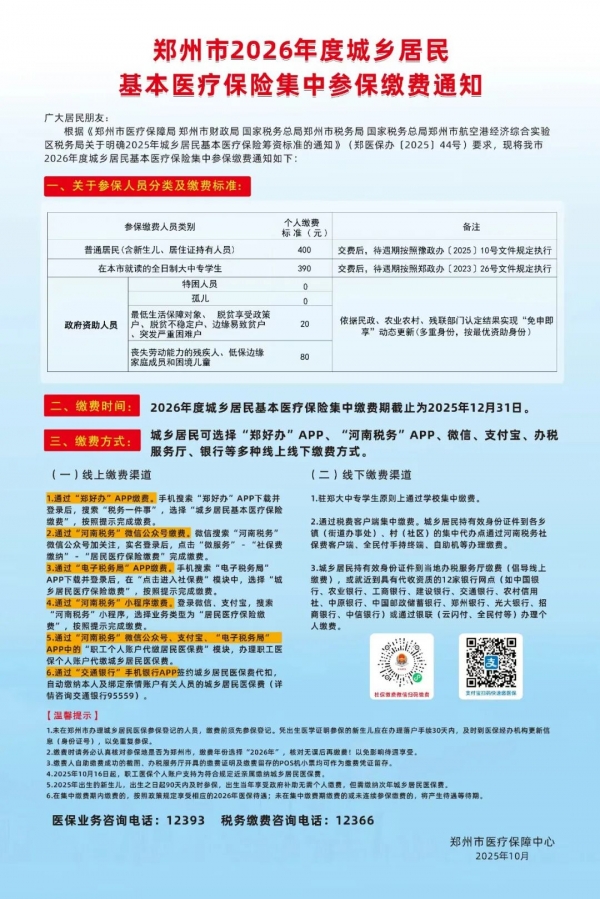暖心提示:郑州市2026年居民医保开始缴费啦!为了给您和家人的健康保驾护航,这份详细的参保指南请一定收好。