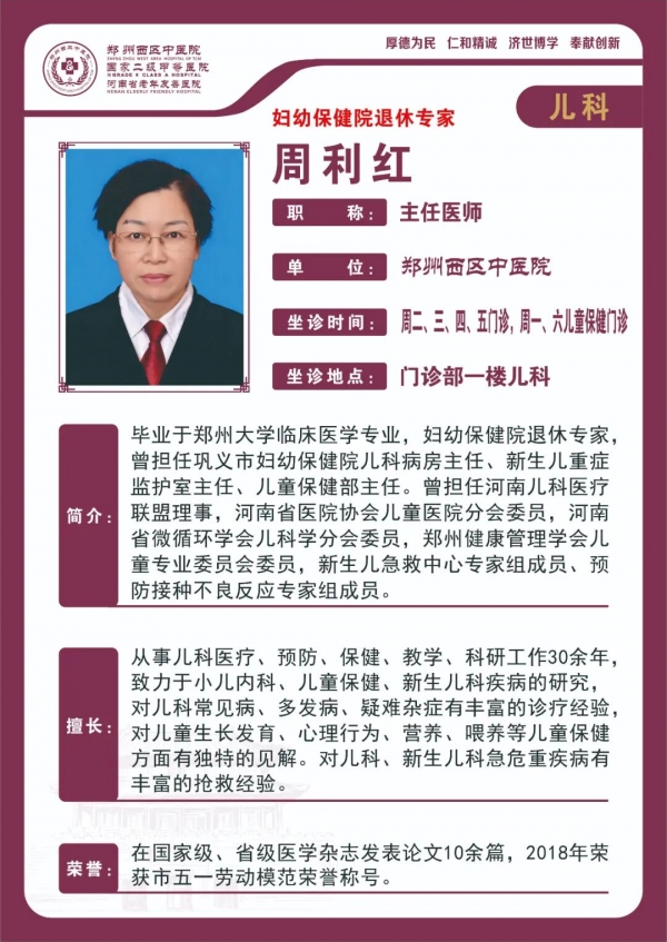 毕业于郑州大学临床医学专业,妇幼保健院退休专家曾担任巩义市妇幼保健院儿科病房主任、新生儿重症监护室主任、儿童保健部主任。曾担任河南儿科医疗联盟理事,河南省医院协会儿童医院分会委员,河南省微循环学会儿科学分会委员,郑州健康管理学会儿童专业委员会委员,新生儿急救中心专家组成员、预防接种不良反应专家组成员。