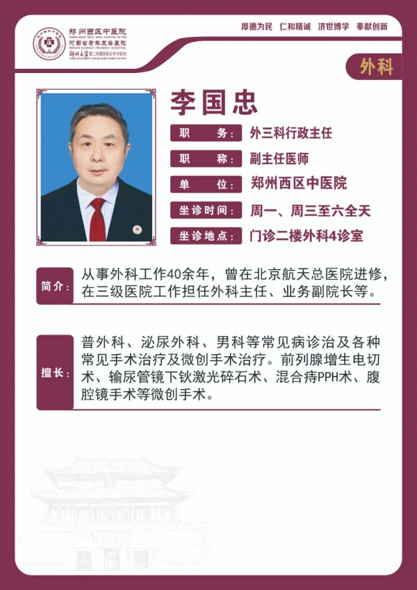 从事外科工作40余年,曾在北京航天总医院进修,在三级医院工作担任外科主任、业务副院长等。