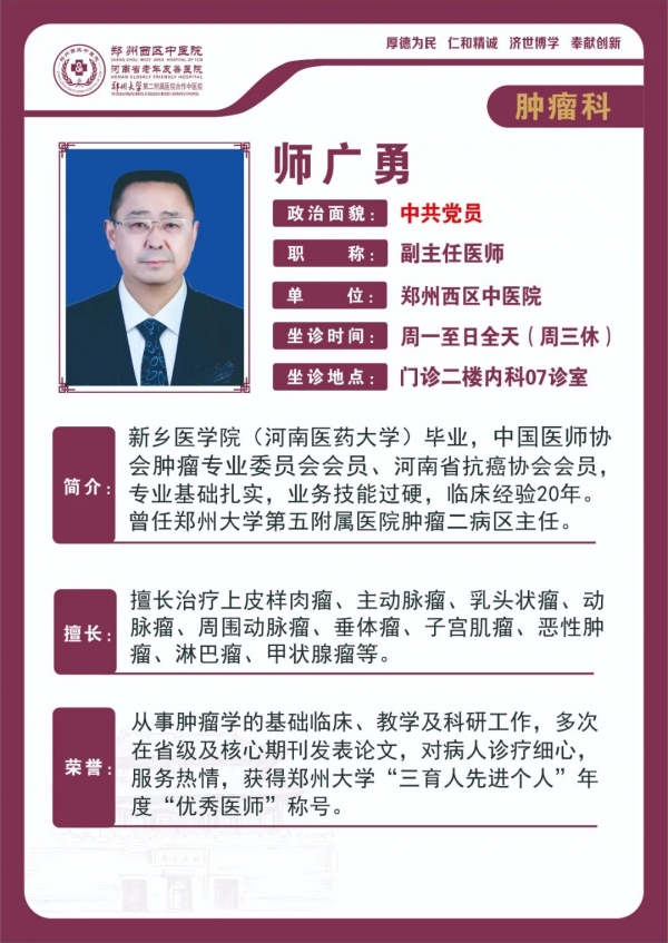 新乡医学院(河南医药大学)毕业,中国医师协会肿瘤专业委员会会员、河南省抗癌协会会员,专业基础扎实,业务技能过硬,临床经验20年。曾任郑州大学第五附属医院肿瘤二病区主任。