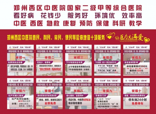 282 浏览作为一所集中医、西医、急救、康复、预防、保健、科研、教学于一体的国家二级甲等综合医院,郑州西区中医院始终秉承“惠民、利民、亲民、便民”的宗旨,致力于提供全面、综合的医疗服务。医院通过推行十大延伸增值服务,切实将“看病难”转化为“就医暖”,让每位患者都能感受到医疗服务的温度与诚意。