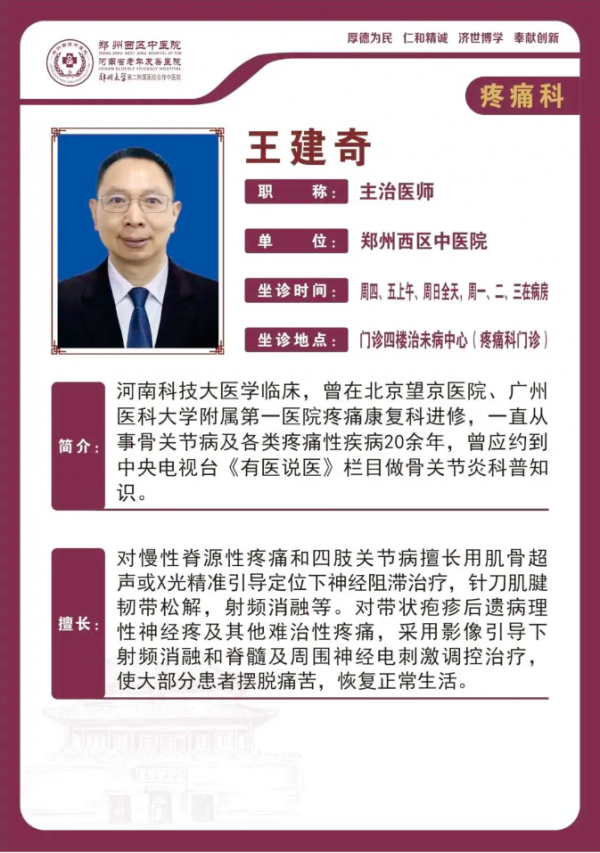 带状疱疹是由水痘‑带状疱疹病毒引起的急性感染性疾病,病毒在水痘痊愈后潜伏于体内,当免疫力下降、劳累、熬夜或身体虚弱时被再次激活,沿单侧神经发病。该病本质上属于病理性神经痛,只是病毒引发神经炎症,累及皮下游离神经末梢,才表现出皮肤损害。典型症状为局部刺痛、灼痛,随后出现成簇水疱、呈带状分布,病程一般2~4 周。越早规范治疗,越能有效减轻疼痛、降低后遗神经痛发生风险。(郑州西区中医院疼痛科 王建奇主任讲解患者带状疱疹情况)超声引导背根神经节脉冲射频镇痛术是治疗带状疱疹及带状疱疹后神经痛的精准微创镇痛技术。(王建奇主任进行微创介入超声引导下胸2胸3背根神经节脉冲射频镇痛术)在超声实时引导下,精准定位病变神经,通过脉冲射频调节神经异常痛觉信号,不开刀、创伤小、安全性高、恢复快,能快速缓解剧烈神经痛、改善生活质量,有效降低后遗神经痛的发生风险,为药物治疗效果不佳、疼痛顽固的患者提供安全有效的镇痛方案。