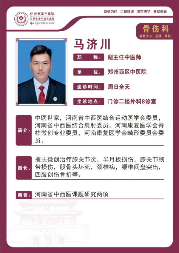 骨伤科:以中医中药及微创手术为特色,针对腰间盘突出、颈椎间盘突出、腰椎管狭窄、膝关节病、膝关节游离体、膝关节半月板损伤、滑膜炎、四肢骨折等疾病开展诊疗。